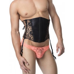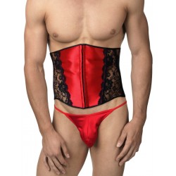 Sassy black lace.   Shimmering French satin.   The structured yet sexy undergarment gives you an incredible look, either just by itself or matched with one of our sumptuous lace panties for men.  With boning at sides for support and shape, hook and eye front opening, and waist cinching lace-up back.   Minimizes waist by up to 3".  Panties available separately.